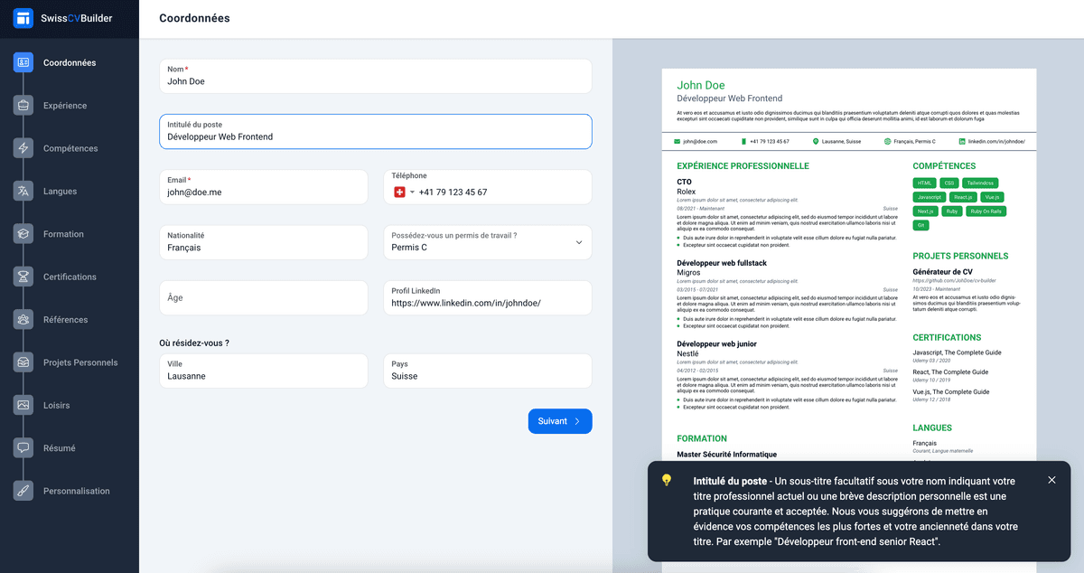Le marché de l'emploi en Suisse a ses spécificités. SwissCVBuilder vous permet de répondre aux attentes des recruteurs.