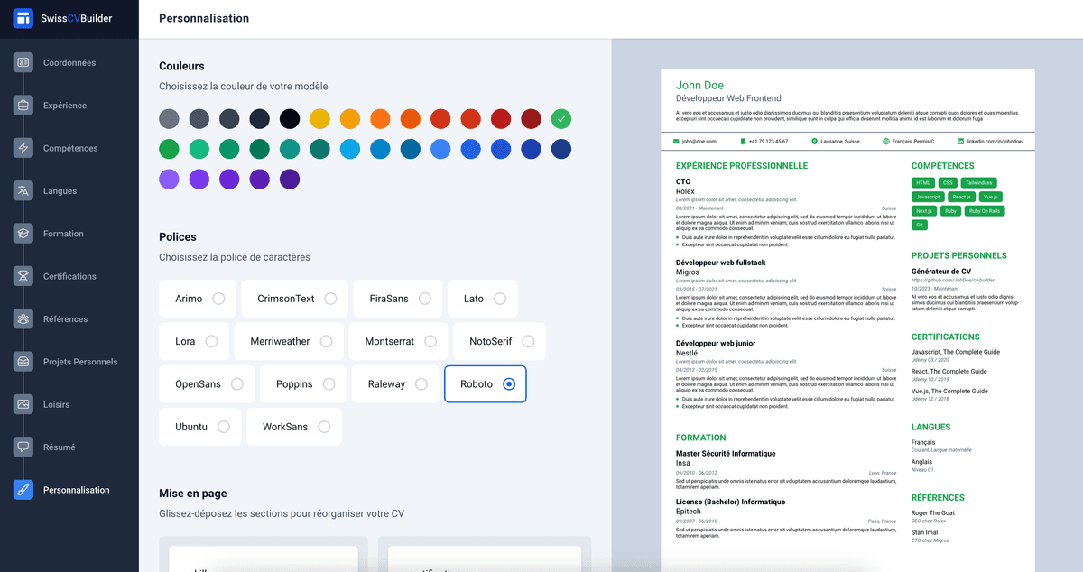 Modifiez la couleur, la police de caractères et organisez les sections de votre CV à votre guise.