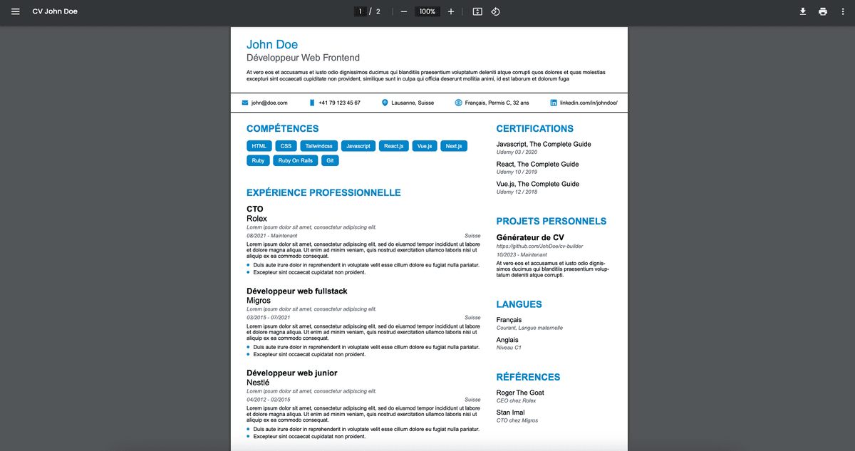 Sélectionnez un modèle de CV Suisse, rédigez le contenu de votre CV et téléchargez le en quelques minutes.