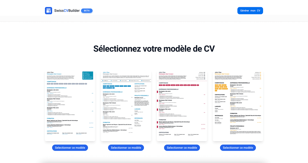 Choisissez parmi nos modèles de CV conçus à la main et adaptés aux attentes des recruteurs suisses.